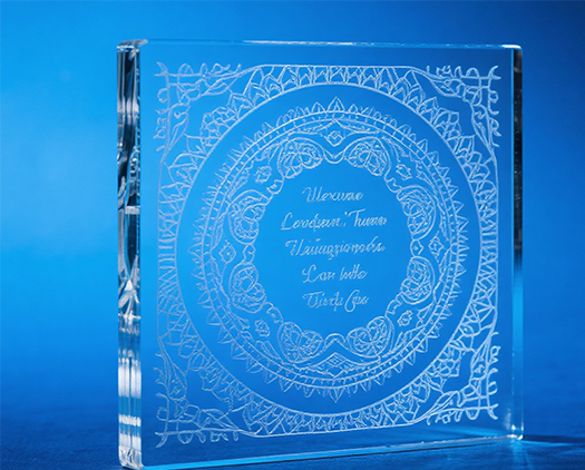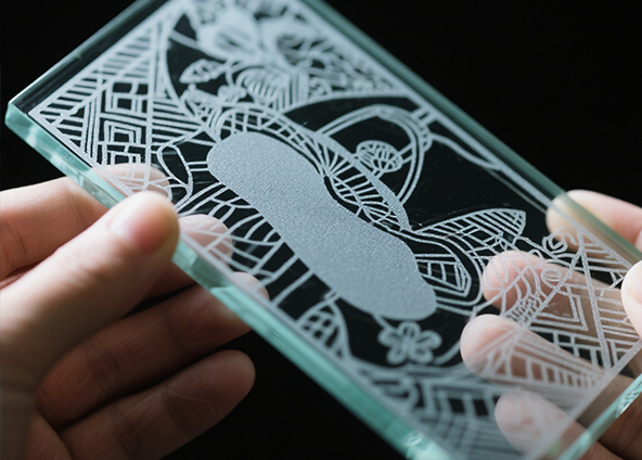 Tá léasair CO₂ absorbtha go maith ag an dromchla gloine agus úsáidtear go coitianta é le haghaidh greanadh dromchla. Is cosúil go bhfuil éifeacht greanta léasair CO₂ mar phatrún frosted, bán, rud a fhágann go bhfuil sé oiriúnach le haghaidh fógraíochta, maisiú ealaíne, agus litreacha bronntanais. Ar an láimh eile, tá tonnfhad níos giorra ag léasair ultraivialait (UV) agus oibríonn siad i mód “próiseála fuar” le crios íosta teasa. Tá léasair UV in ann línte míne, cóid QR, agus lógónna a tháirgeadh.